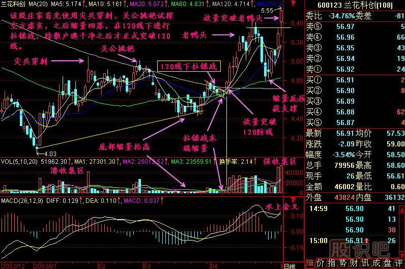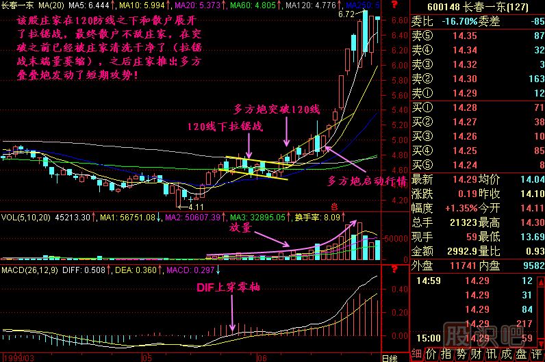 小結(jié):120線下拉鋸戰(zhàn)是散戶消耗戰(zhàn),散戶最終都將在拉鋸戰(zhàn)中戰(zhàn)敗而乖乖交出籌碼,在拉鋸戰(zhàn)末端一般都有量萎縮,說明已經(jīng)達(dá)到莊家洗盤的目的,那么只要后期一根放量陽線突破拉鋸戰(zhàn)壓力線和120防線,行情就啟動(dòng)了,起碼要漲一段路。