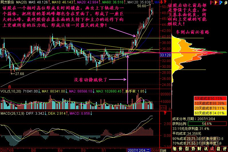 小結(jié):本節(jié)所講的“山”,是籌碼峰的意思,籌碼峰可能會(huì)阻擋住股價(jià)的上行,會(huì)有一定的壓力,但是如果該股不畏懼籌碼峰的壓力,敢于向上突破,且前期總體漲幅不大,從坨理論分析是上升中繼坨或者底坨的話,再加上一定的基本面、大勢(shì)的配合,則會(huì)形成車到山前必有路的走勢(shì),最終都會(huì)向上突破所有的壓力,一旦突破所有的壓力,就叫車到山前必有路,已經(jīng)頭頂一片藍(lán)天了,走出一段行情也在情理之中。