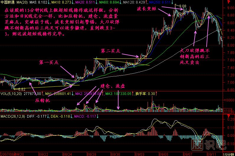 小結:精確的超短線盈利買賣點是建立在對廣通各種單一技術的熟練運用上的,只要學好了各種單一技術,并搞清楚每一個單一技術的適用位置,就可以在15分鐘K線圖上運用2+3均線系統(tǒng)技術操作了。