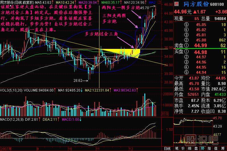 我要講一下多方炮,兩根陽線夾一根陰線,放量,這是典型的多方炮態(tài)勢,它的市場意義是什么呢?第一天開始拉高,然后輕輕地放下來,看看有沒有人吐出來,讓股價回一下,然后再上去,在這兒來了個一波三折,洗一洗盤,然后再上揚。拉高,洗盤,再拉高,在K線圖形上形成拉高是陽線,洗盤是陰線,再拉高又是陽線,這么一組標準的多方炮圖形,這是一種強勢信號。這種信號如果正好出現(xiàn)在金三角,就叫多方炮過金三角。如果股價沒有沖過去或者還在夾角中,那就叫金三角下多方炮和金三角中多方炮,這都是有定式的。