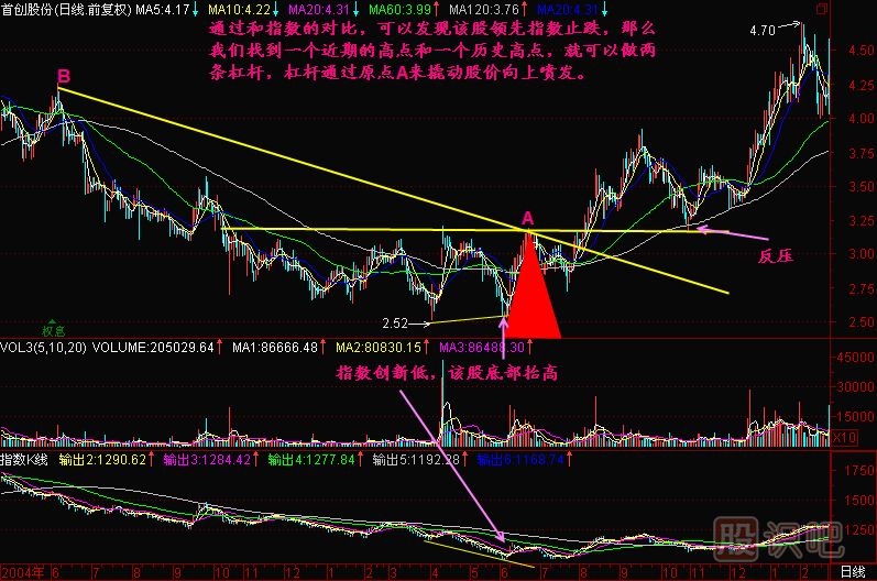 小結(jié):在指數(shù)長期下跌后,我們可以通過尋找那些領(lǐng)先于指數(shù)底部抬高的個股,這些個股往往是主力資金提前布局的股票,找到這樣的股票以后,我們就找到它底部打樁區(qū)間的一個高點做為原點,通過這個原點與一個近期的歷史高點做線,得到一根杠桿,另外一根杠桿就是這個原點底部區(qū)間的高點連線或者就是通過它做的水平線。