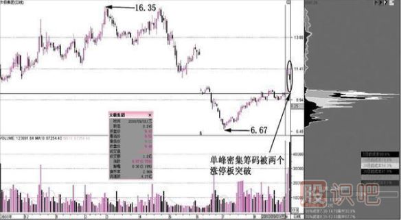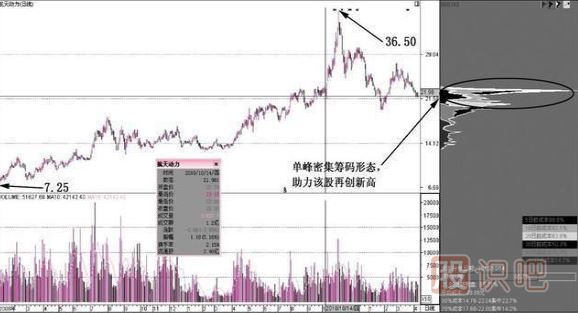 單峰密集形態(tài),是籌碼分布形態(tài)中、比較密集的籌碼密集峰值。相比較其他的籌碼分布形態(tài),該單峰密集籌碼分布形態(tài),上方和下方的籌碼幾乎是沒(méi)有的。這樣看來(lái),股價(jià)在之前必然是經(jīng)過(guò)了充分的換手之后,才造成了籌碼的單一密集峰的形成。