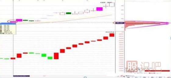 觀察下圖可以發(fā)現(xiàn),圓圈處那天,該股的籌碼高度集中(呈現(xiàn)等腰三角形),大致集中在57.1元附近,說(shuō)明當(dāng)天在該價(jià)格附近介入這只股票的人最多,上方?jīng)]有藍(lán)色的套牢盤(pán)籌碼,這個(gè)就是所謂的“小頭爸爸”,即是一種上漲預(yù)兆。