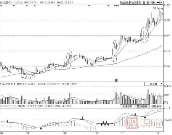 圖7-27是農(nóng)發(fā)種業(yè)(600313)的日k線圖,隨著成交量不斷地放大,股價的波動重心不斷上移。股票短線看盤技巧跟您說個股走勢中最容易賺錢的買入點(diǎn)位在圖中可以看到,股價三次形成的突破有一個明顯的共性,那就是在股價創(chuàng)下了近期新高的時候,突破K線指標(biāo)都隨之發(fā)出了買點(diǎn)提示,指標(biāo)的提示說明此時的短線突破是真實(shí)可靠的,量能放大的性質(zhì)是資金在不斷地建倉。