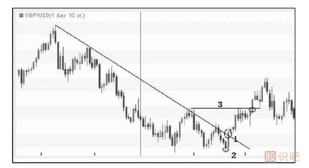 圖1-6是英鎊/美元日?qǐng)D。匯價(jià)受到下行趨勢(shì)線打壓,持續(xù)下行。盡管后期出現(xiàn)毛刺,但是匯價(jià)仍然下行,未能突破下降趨勢(shì)線。然而,匯價(jià)未能創(chuàng)下新低(條件2成立),而是再次測(cè)試趨勢(shì)線后,在次低點(diǎn)得到支持。最終匯價(jià)以大陽(yáng)燭突破趨勢(shì)線,這就又滿足了條件1。匯價(jià)之后突破了最低點(diǎn)和次低點(diǎn)之間的高點(diǎn)(該處對(duì)趨勢(shì)線的測(cè)試出現(xiàn)了毛刺)。這里123法則形成的順序是2——1——3。
