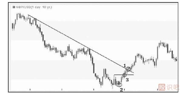圖1-5是英鎊/美元日?qǐng)D走勢(shì)。匯價(jià)受到下行趨勢(shì)線打壓持續(xù)下跌,但是創(chuàng)下最低點(diǎn)后,匯價(jià)開(kāi)始反彈,下方的次低點(diǎn)形成(達(dá)到條件2)。其后匯價(jià)突破了最低點(diǎn)和次低點(diǎn)之間高點(diǎn)(條件3形成),并最終突破趨勢(shì)線(達(dá)到條件1)。本例中123法則形成的順序是2——3——1。