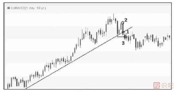 圖1-1是歐元/美元日?qǐng)D走勢(shì)。匯價(jià)首先跌破了上行趨勢(shì)線,滿足了條件1。之后匯價(jià)再次上探前高,未能創(chuàng)下新高,滿足了條件2(高位錄得一根吊頸K線),之后匯價(jià)跌破了兩個(gè)高點(diǎn)之間低點(diǎn),即最近低點(diǎn),滿足了“跌破前低”的條件3。投資者可以選擇匯價(jià)在突破低點(diǎn)、滿足第三個(gè)條件時(shí)做空,這一法則的順序是1——2——3。