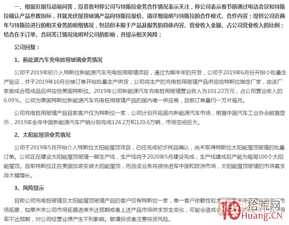 秀強(qiáng)股份表示,公司于2019年初介入特斯拉新能源汽車充電樁用玻璃項(xiàng)目。公司為美國特斯拉新能源汽車充電樁用玻璃產(chǎn)品的國內(nèi)唯一供應(yīng)商,目前訂單量約一萬片每月。公司于2019年5月開始介入特斯拉太陽能屋頂項(xiàng)目,已經(jīng)完成初步樣品確認(rèn)。