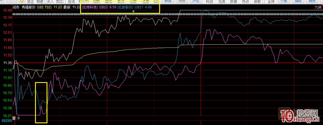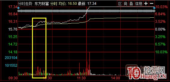 在這個分時圖中很清楚,東方財富先動,秀強的資金立刻跟上!