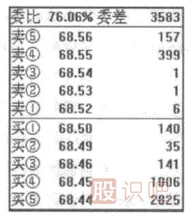 從圖中看出:主力在68.50元掛出140手買單后(其實不止這么點,前面已經(jīng)成交了幾百手)。然后在68.45元和68.44元分別掛出兩個四位數(shù)大買單,中間“跳躍”了68.49、68.48、68.47、68.46四個價位(注意,68.49的35手買單和68.46元的141手買單是散戶的掛單,不是主力的掛單),其中68.48和68.47兩個價位無任何掛單,就是說連散戶的掛單也沒有。這是因為主力根據(jù)市場喜歡在整數(shù)位掛單的習慣,故意在非整數(shù)處68.44元掛出2825手買單,以起到接盤的烘托作用。