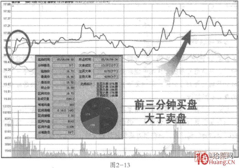第三種開盤形態(tài)是平開,即開盤價與昨天的收盤價一樣。平開開盤沒有方向性提示,關(guān)鍵看頭一筆大單交易的方向:第一筆大單是買盤,并且連續(xù)在3分鐘內(nèi)買盤大于賣盤,全天方向向上;反之,則向下。我們先看圖2-13