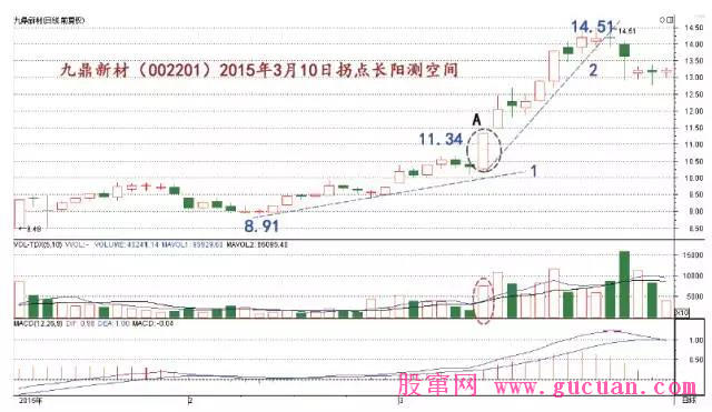 圖2 中,九鼎新材(002201)日線走勢(shì),在2015 年3 月10 日走出顯著放量漲停長(zhǎng)陽(yáng)線(A 處)。此時(shí),我們即可認(rèn)定該線體,就是上升趨勢(shì)的加速拐點(diǎn)。然后積極買(mǎi)進(jìn),止損位就設(shè)在長(zhǎng)陽(yáng)線的實(shí)體下沿,即開(kāi)盤(pán)價(jià)位置。隨后,進(jìn)行波段上漲幅度預(yù)估。波段行情的低點(diǎn)8.91 元,拐點(diǎn)長(zhǎng)陽(yáng)線的收盤(pán)價(jià)11.34 元,然后帶入公式M=C2/L 中,即可得到測(cè)算結(jié)果: