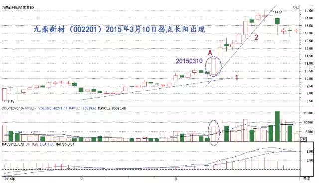 如圖1,九鼎新材(002201)日線走勢(shì)圖顯示,股價(jià)見(jiàn)波段低點(diǎn)后,沿趨勢(shì)線1 逐漸上漲,從A 處帶大量漲停長(zhǎng)陽(yáng)線起,上漲斜率加大(見(jiàn)趨勢(shì)線2)。A 處長(zhǎng)陽(yáng)線就是上漲力度發(fā)生改變的加速拐點(diǎn)長(zhǎng)陽(yáng)線,下面簡(jiǎn)稱(chēng)為“拐點(diǎn)長(zhǎng)陽(yáng)線”。統(tǒng)計(jì)發(fā)現(xiàn),A 處走出長(zhǎng)陽(yáng)線之前的15 個(gè)交易日,股價(jià)上漲幅度不到20%,但是,拐點(diǎn)長(zhǎng)陽(yáng)線之后的8 個(gè)交易日,股價(jià)漲幅達(dá)到25%。前后上漲力度比值接近1:3。