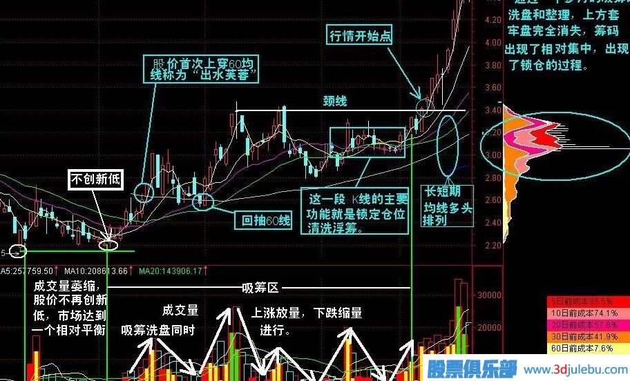 二、頸線的位置(狹義)。簡而言之就是主力離開成本區(qū)的位置,在底部區(qū)域吸籌的個股可以認(rèn)為頸線之下就是主力成本區(qū)。