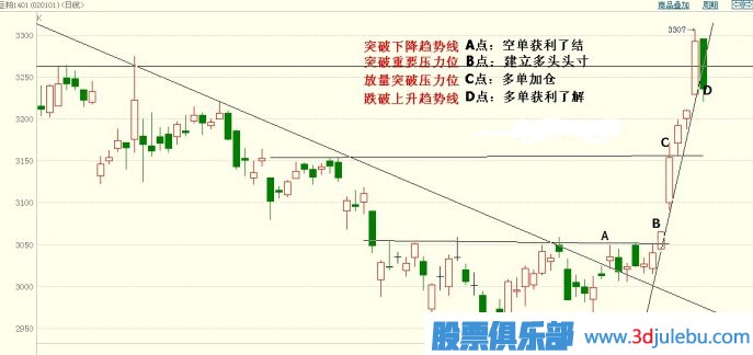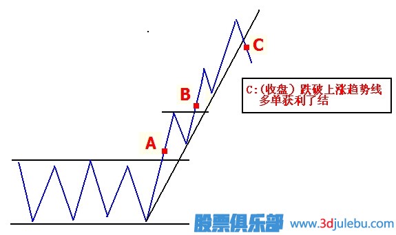 3、收盤跌破上漲趨勢線,多單獲利了結(jié)。