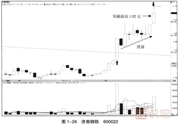 (3)2006年10月25日,該股利用中陽線跳出洗盤區(qū),洗盤行動基本結(jié)束