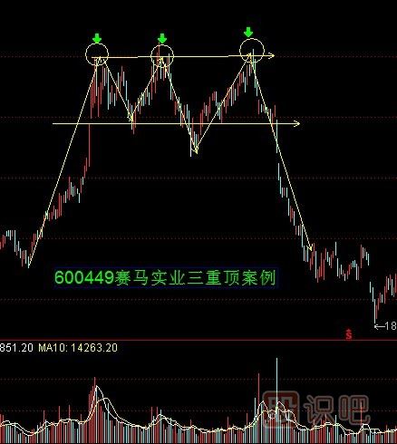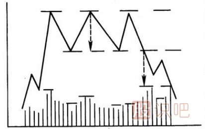 三重頂。除了所有的波峰都處在同一價(jià)位之外,與頭肩形相似。每個(gè)上升行情的波峰應(yīng)伴隨較少的成交量。當(dāng)市場放量跌破兩個(gè)波谷時(shí)形態(tài)完成。測算技法是從突破點(diǎn)向下投射形態(tài)的高度。反抽下面一根直線的現(xiàn)象并不少見。