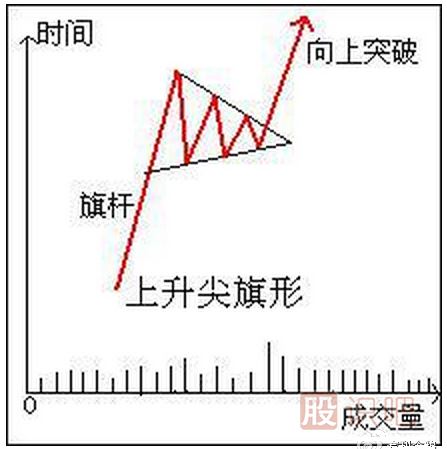 由邊收斂的旗形發(fā)育而成的,而三角旗形往往順著原有趨勢(shì)而不是相反。三角旗形交易量減少的比旗形更快(因此走勢(shì)得以快速收斂)。三角旗形中,當(dāng)價(jià)格移出圖形時(shí),往往會(huì)加速,而不是向旗形那樣會(huì)再次突然爆發(fā)。量度上三角旗形與旗形的情況相似。