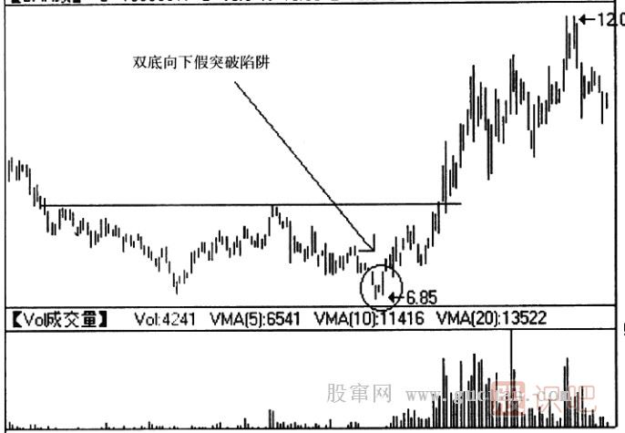 一是雙底向下假突破陷阱(如圖),當(dāng)雙底的第一個波谷形成后,市場向上縮量反彈,然后再次下跌,并且擊穿了第一波谷,正當(dāng)市場預(yù)期繼續(xù)下跌時,卻被力挽狂瀾的多頭主力逆勢拉起,形成了第二個波谷低于第一個波谷的雙重底形態(tài)。這是一個“空頭陷阱”。