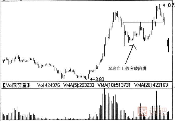 二是雙底向上假突破陷阱(如圖),當(dāng)股價經(jīng)過兩次探底成功后,股價開始向頸線位逼近并一舉突破頸線位。但是正當(dāng)市場預(yù)期繼續(xù)上漲時,股價通常在頸線位盤橫數(shù)日,終于再次跌回頸線位以下。最糟糕是,股價甚至繼續(xù)下行并創(chuàng)出新低,徹底破壞了雙底形態(tài)。這是一個“多頭陷阱”。
