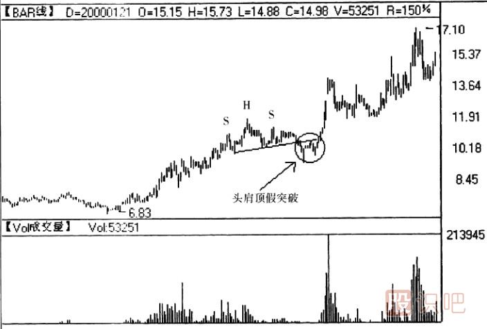 (3)頭肩頂形態(tài)的左肩和頭部形成后,也不一定意味著頭肩頂形態(tài)必然形成。即便是右肩形成,如果市場(chǎng)試探頸線時(shí)獲得強(qiáng)大的支撐,股價(jià)隨后創(chuàng)出新高恢復(fù)原有趨勢(shì),此時(shí)頭肩頂就面臨失敗形態(tài)。