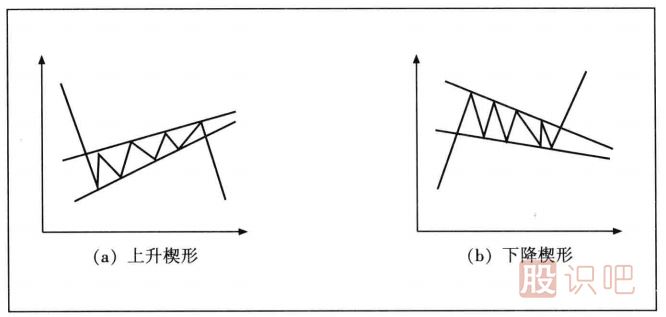 楔形形態(tài)的股價(jià)走勢(shì)也是在兩條收斂的直線之間變動(dòng),成交量也是逐漸遞減。不過(guò)與三角形不同的是,楔形的兩條直線是同時(shí)上傾或下斜的。一般來(lái)說(shuō),楔形又分為上升楔形和下降楔形。其中上升楔形是指兩條直線同時(shí)上傾,往往出現(xiàn)在熊市反彈整理形態(tài)中,而下降楔形就是指兩條直線同時(shí)下斜,往往出現(xiàn)在牛市整理形態(tài)中。