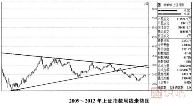如上圖,是2009-2012年上證指數(shù)周線走勢(shì)圖,從圖中我們清楚地看到股指周線形成了一個(gè)很大的三角形形態(tài)。比較熟悉掌握三角形形態(tài)的投資者就可以判斷出,股指在2/3的位置并沒有形成向上突破,這時(shí)就應(yīng)該保持謹(jǐn)慎了。果然,在多次觸及三角形的上方突破未果之后,2011年股指展開了大幅殺跌。