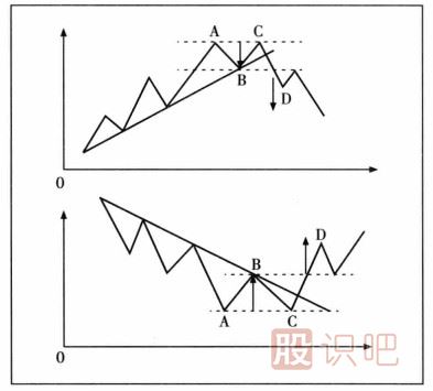 如上圖是對稱三角形示意圖。一般來說,在判別對稱三角形的形態(tài)時,應(yīng)該注意以下幾個方面:首先,在對稱三角形中股價越接近其頂點而未能突破其界限時,其力量越小,太接近頂點的突破通常會失效。根據(jù)以往的歷史經(jīng)驗,突破點應(yīng)該位于距離三角形底邊1/2—2/3處的地方。其次,股價向上突破三角形時,需要成交量的配合,向下突破則沒有這個需求。
