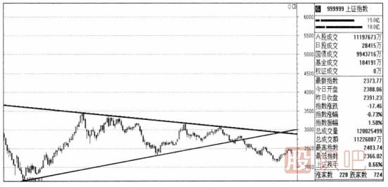 如上圖是2009-2012年上證指數(shù)軸線走勢圖,從圖中我們清楚地看到股指周線形成了一個很大的三角形形態(tài)。比較熟悉掌握三角形形態(tài)的投資者就可以判斷出,股指在2/3的位置并沒有形成向上突破,這時就應(yīng)該保持謹慎了。果然,在多次觸及三角形的上方突破未果之后,2011年股指展開了大幅殺跌。