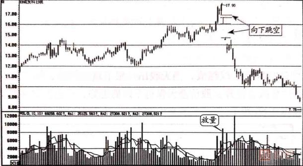 如圖1-40所示的是成發(fā)科技(600391)的日k線走勢圖。該股從前期低點11.50元開始了一輪上升行情,最高漲到了近18.00元,漲幅已經(jīng)接近60%。隨后,在圖中標識處形成了連續(xù)兩個向下跳空的走勢,第一次留下的跳空缺口比較小,但是出現(xiàn)跳空的當天成交量出現(xiàn)了明顯的放大,也就是下跌放量;第二個跳空缺口非常大,幾乎是前一個跳空缺口的5~6倍之多,股價也以跌停報收。這種走勢已經(jīng)很明顯地預(yù)示了未來股價的下跌趨勢。 因此,投資者必須及時賣出手中的持股,以規(guī)避后市大幅下跌帶來的風險。