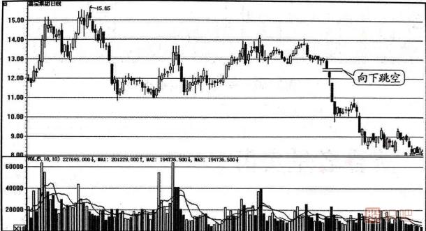 向下跳空中的股價在第二天的運行中空方的力量明顯比多方的力量要強得多。 如果這種走勢是出現(xiàn)在股價長期或大幅上漲的頂部高位區(qū)域,則標志著股價出現(xiàn)下跌的可能性相當大;如果向下跳空出現(xiàn)在股價下跌的中途,往往是股價進人加速下跌的征兆。 無論股價出現(xiàn)在哪一個位置,都是投資者減倉或清倉的時機。