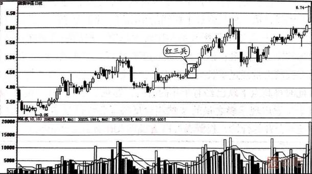 紅三兵中每一天的收盤價(jià)都在向上攀升并超過(guò)前一天的收盤價(jià),股價(jià)穩(wěn)健地逐步向上,是一種極為常見的而且準(zhǔn)確性很高的上升形態(tài)。 當(dāng)股價(jià)運(yùn)行經(jīng)過(guò)長(zhǎng)時(shí)間的下跌之后,一旦在底部企穩(wěn),隨后又出現(xiàn)紅三兵的K線組合,說(shuō)明此時(shí)市場(chǎng)上多方的能量正在不斷地聚集,后市股價(jià)極有可能出現(xiàn)大幅度上升,從此走出一波大行情來(lái)。