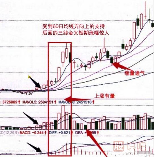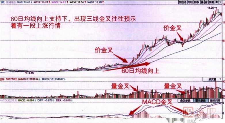 (5)5日、10日均線的方向金叉向上,此時如果60日均線也能方向向上,則助漲。
