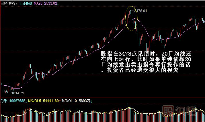 觀察圖2,我們看到當(dāng)股指在3478點(diǎn)見(jiàn)頂時(shí),K線圖中已經(jīng)出現(xiàn)了見(jiàn)頂K線組合(黃昏之星)。但20日均線仍在向上運(yùn)行,這表明此均線對(duì)于股指或股價(jià)的短期變化反映過(guò)慢,此時(shí)如果僅僅依靠20日均線發(fā)出賣出指令再行操作的話,相信不少投資者已經(jīng)遭受損失。因此我們?cè)谂袛喙芍富蚬蓛r(jià)后期如何發(fā)展時(shí)要結(jié)合5日均線,K線形態(tài)、MACD指標(biāo)、布林線等其他技術(shù)指標(biāo)進(jìn)行綜合分析。
