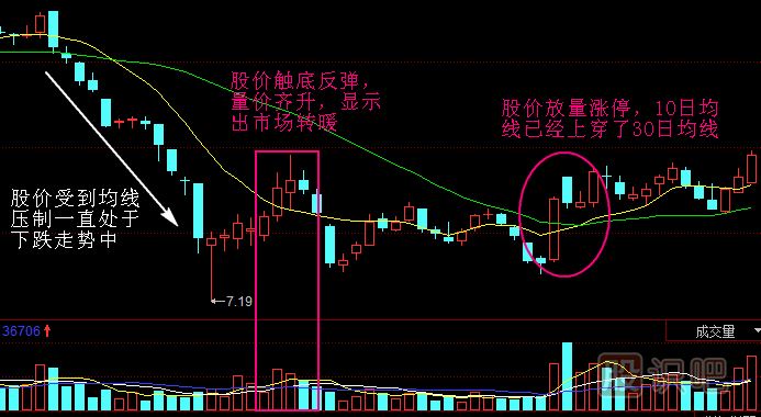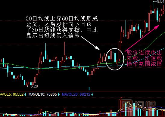 10日均線上傳30日均線形成金叉,顯示市場短線繼續(xù)強(qiáng)勢,是短線買入信號;10日均線下穿30日均線形成死叉,顯示市場短線持續(xù)疲弱,成為短線賣出信號。