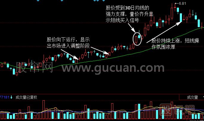 如上圖所示,該股在上漲途中出現(xiàn)了下跌回調(diào),但是股價回調(diào)至30日均線附近時獲得了強有力的支撐,兩次回調(diào)都沒跌破均線,之后開始放量上漲連續(xù)收陽,由此發(fā)出短線買入信號。之后股價持續(xù)拉升,短線投資者在回調(diào)時適時地介入其中,即可獲利。